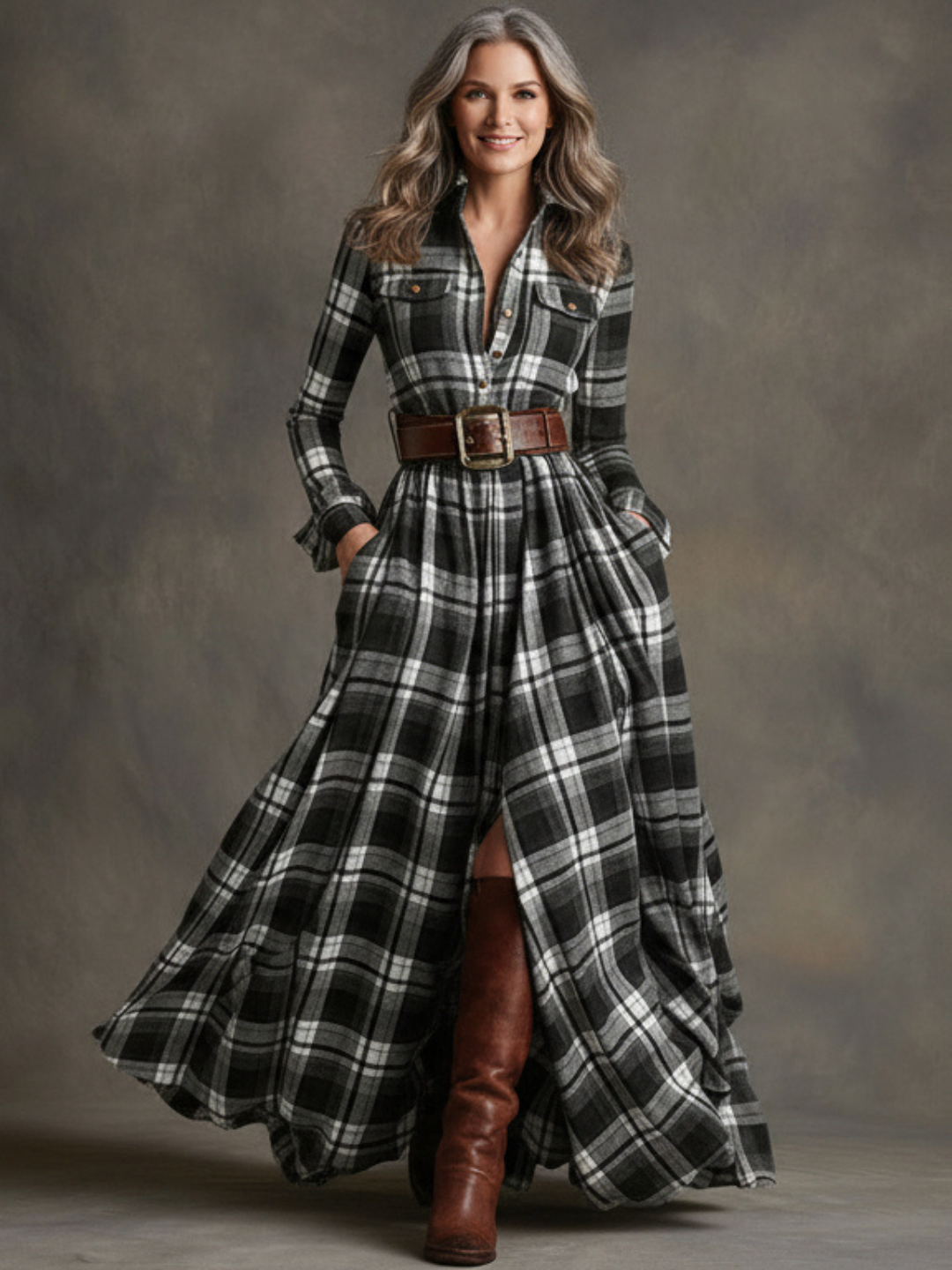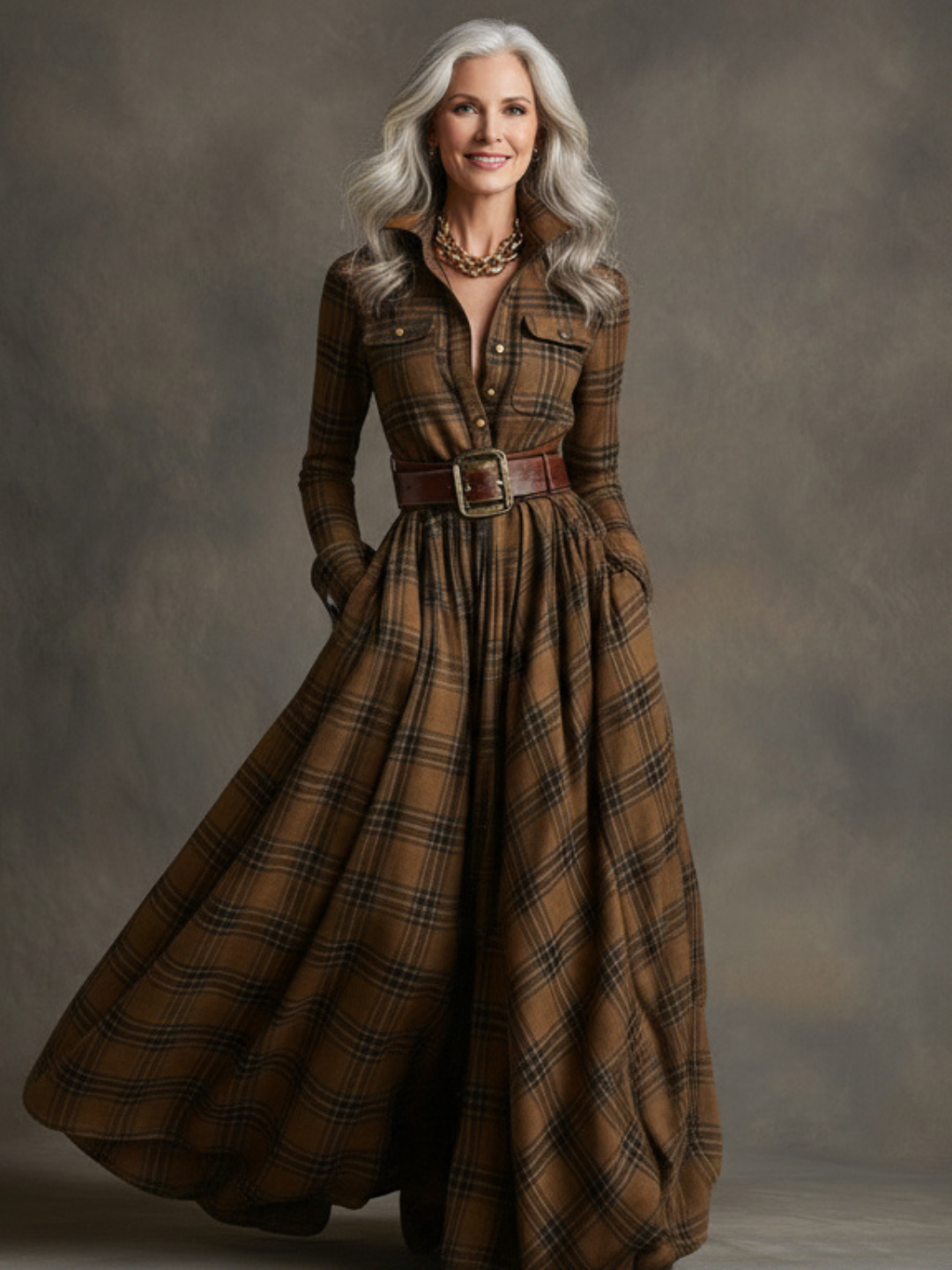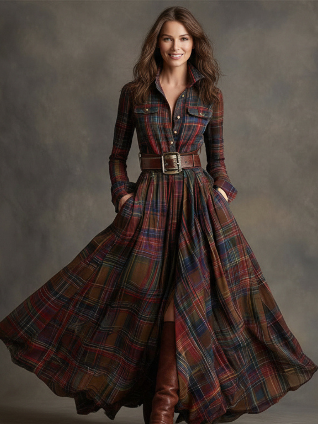 Made in a rich, heritage-inspired plaid, this dress offers graceful movement with every step. The softly tailored bodice, full flowing skirt, and adjustable belt, included with the dress, work together to enhance your natural shape while ensuring all-day comfort.