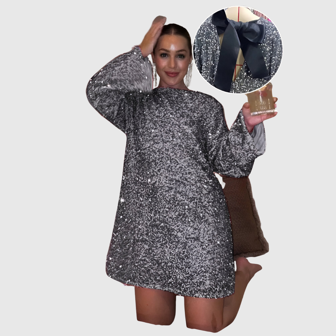 This charming dress features a straight-cut silhouette with long sleeves and a playful mini length, perfect for festive occasions. The fabric is covered in shimmering accents that reflect the light, adding subtle glamour. Finished with a feminine bow detail on the back, it’s designed to make you feel confident, stylish, and celebration-ready.